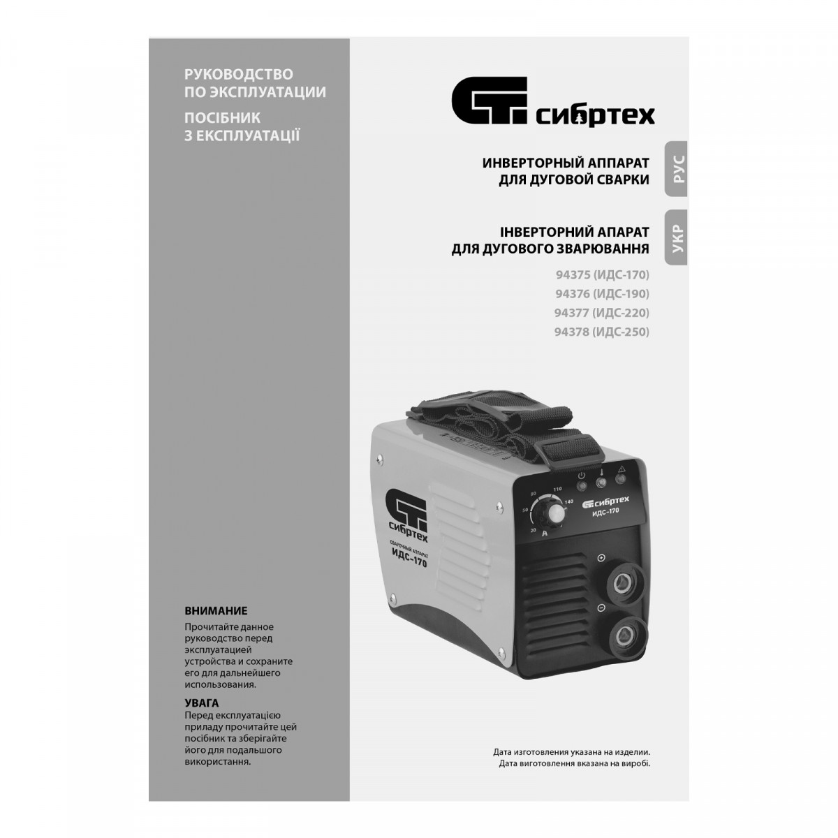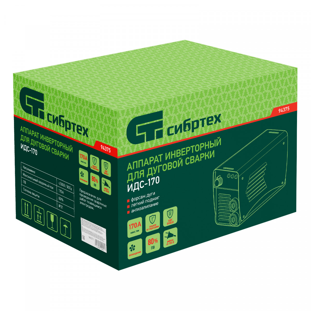 Аппарат инверторный дуговой сварки ИДС-170, 170 А, ПВ 80%, диаметр электрода 1.6-3.2 мм Сибртех