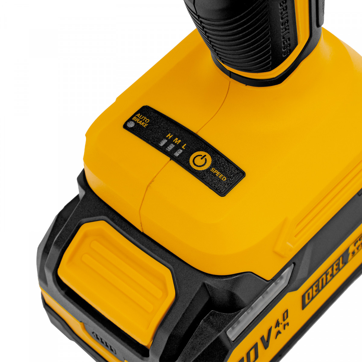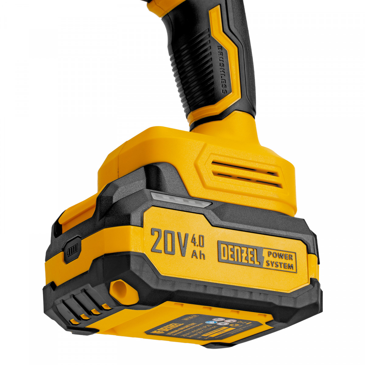 - Универсальность — аккумулятор Li-Ion емкостью 4 А·ч совместим со всеми инструментами единой платформы Denzel Power System 20V.
