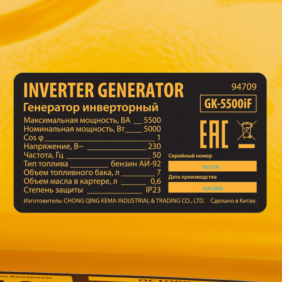 Генератор инверторный GK-5500iF, 5,5 кВт, 230 В, ручной старт DENZEL