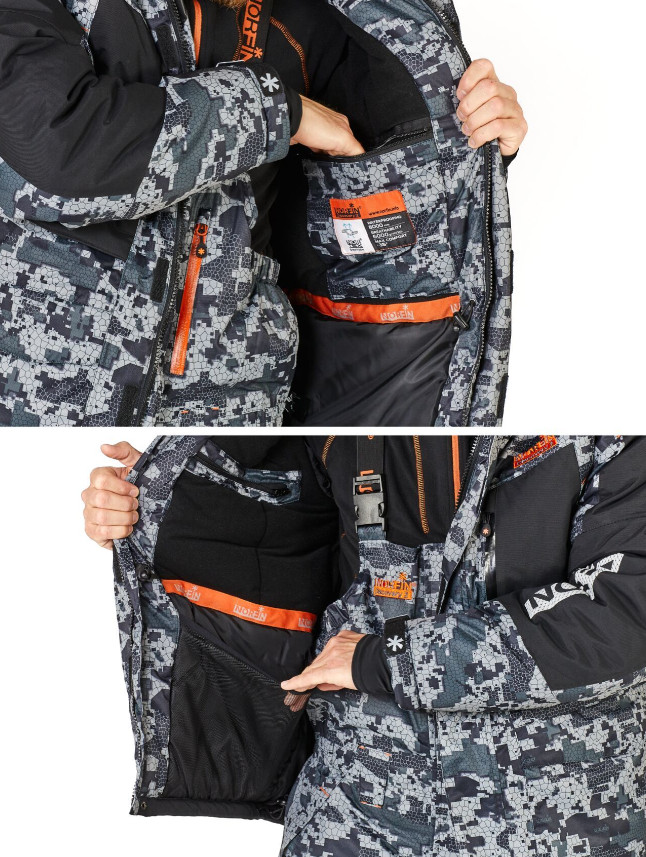 Костюм зимный, рыболовный, куртка и полукомбинезон из мембраны NORTEX BREATHABLE, водонепроницаемость 8000 мм, дышащая способность материала 6000г на кв.м за 24 ч, утеплитель HOLLOFIL. Рекомендованная температура до -35 град.С