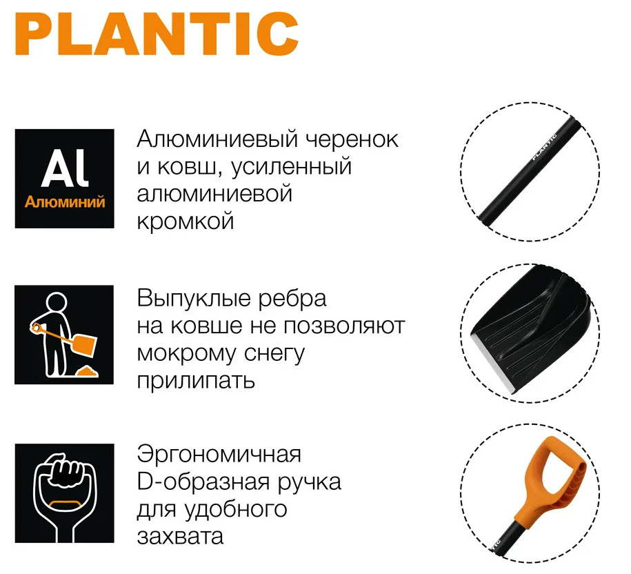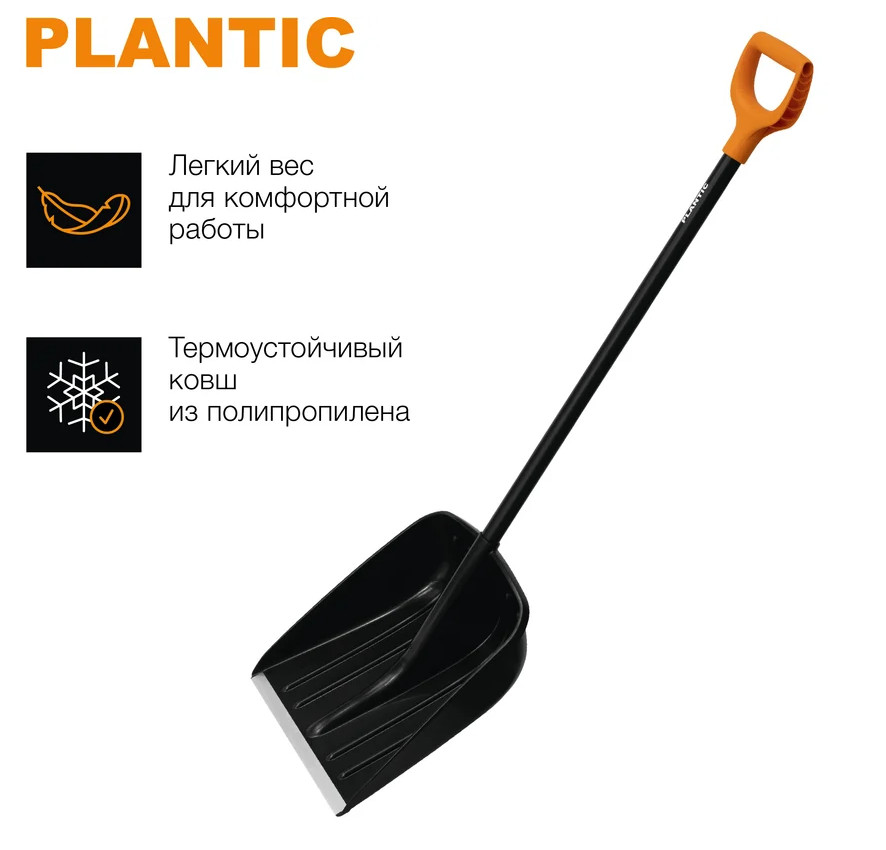 Ковш изготовлен из полипропилена и усилен алюминиевой кромкой. Выпуклые ребра на ковше не позволяют мокрому снегу прилипать.