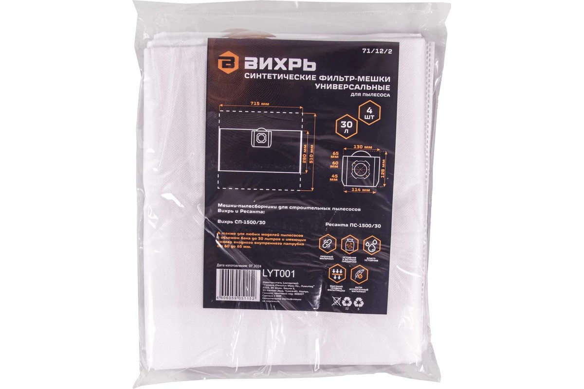 Мешки для пылесоса синтетические 30л 4шт Вихрь