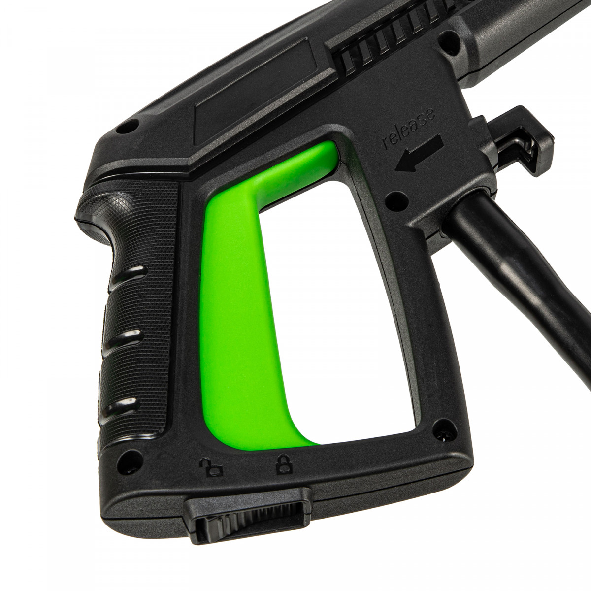- Быстрая подготовка к работе — шланг соединяется с пистолетом в одно нажатие без применения инструмента и легко подключается к моечной машине через быстросъемный адаптер.