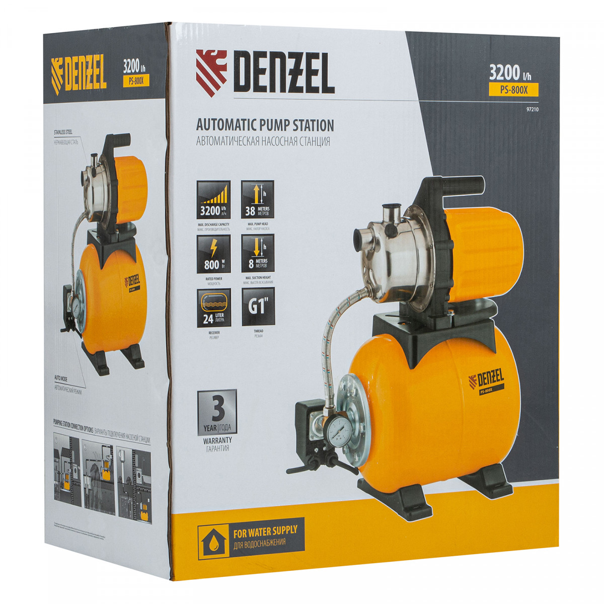 Насосная станция PS800X, 800 Вт, 3200 л/ч, ресивер 24 л, подъем 38 м, нержавейка Denzel