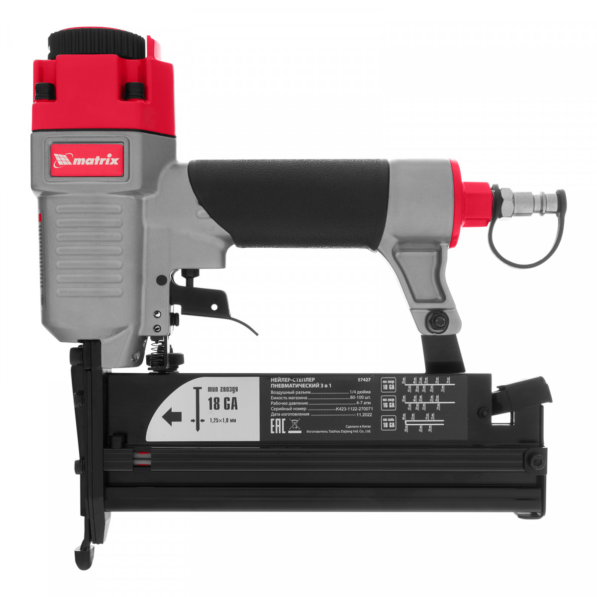 Пневматический нейлер-степлер 3 в 1 Matrix 57427 способен забивать на регулируемую глубину скобы 18 GA и гвозди 18GA и 16GA. Используется для фиксации паркетной доски, фанеры, ДВП, шифера, гипсокартона, ткани и бумаги. Пригодится во время ремонта, а также для сборки мебели и отделочных работ. Расход воздуха составляет 107 л/мин, поэтому нейлер-степлер можно подключать к любому типу компрессоров.