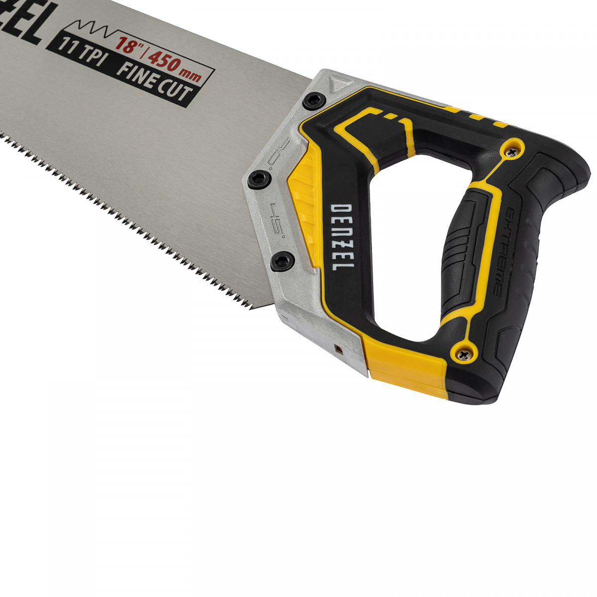 Ножовка по дереву Denzel 24140 длиной 450 мм, с зубьями с шагом 9 TPI и 3D-заточкой, с металлопластиковой рукояткой, предназначена для продольной и поперечной распиловки заготовок из древесины, ДСП, ДВП, МДФ, ламината, а также из ПВХ (труб, панелей, коробов). Подходит для спиливания молодых веток. Зубья с шагом 9 TPI позволяют выполнять быстрый рез. Ножовка используется для проведения столярных работ в мастерской и на дачном участке.