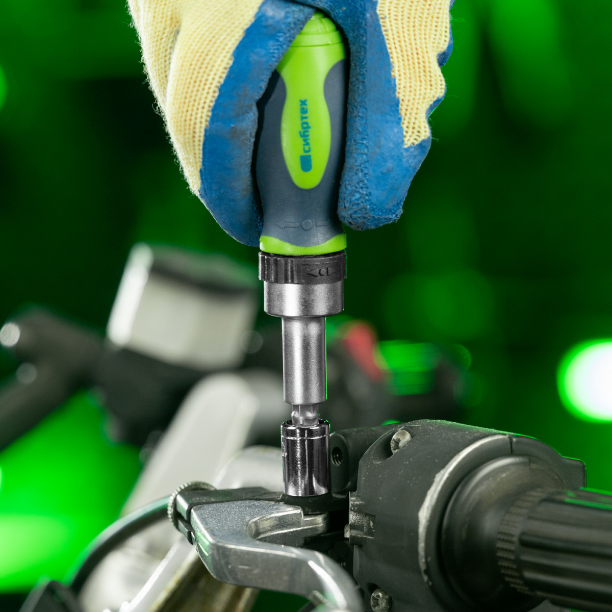 - Надежная фиксация торцевых головок — благодаря металлическому шариковому замку адаптер с присоединительным размером 1/4″ крепко удерживает насадки.