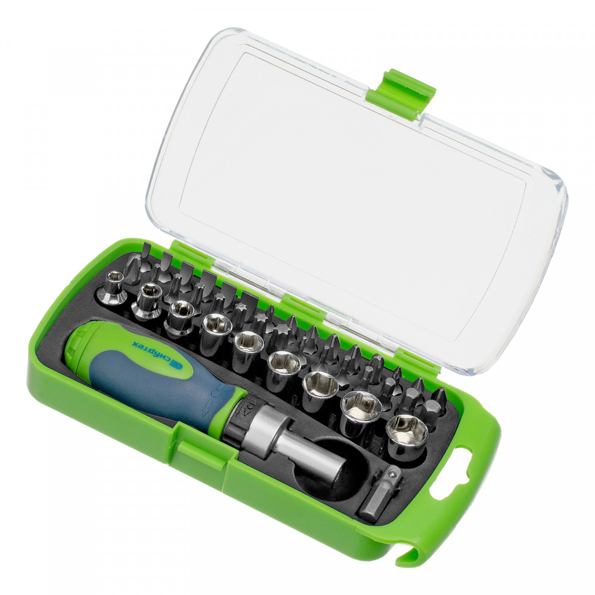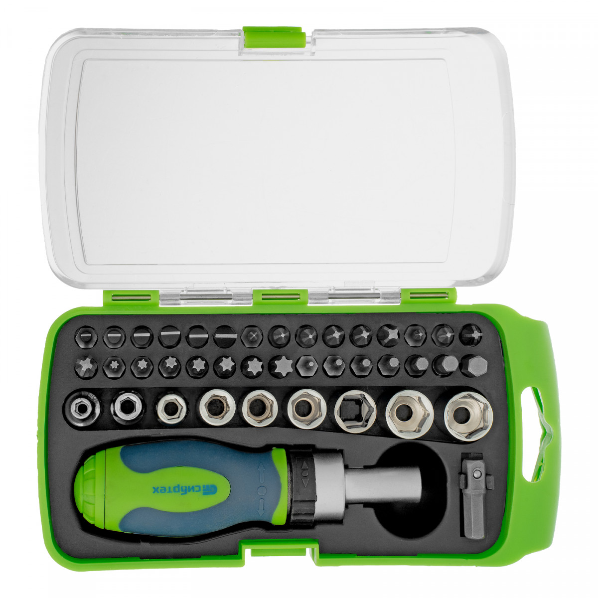 Отвертка реверсивная - 1 штБиты 25 мм: РН0, РН1, РН2, РН3, PZ0, PZ1, PZ2, PZ3, SL3, SL4, SL5, SL6, SL7, H1.5, H2, H2.5, H3, H4, H5, H6, T10, T15, T20, T25, T27, T30, T40 - 27 штТорцевые головки: 4 мм, 5 мм, 6 мм, 7 мм, 8 мм, 9 мм, 10 мм, 11 мм, 12 мм - 9 штАдаптер для бит 1/4'' - 1 шт