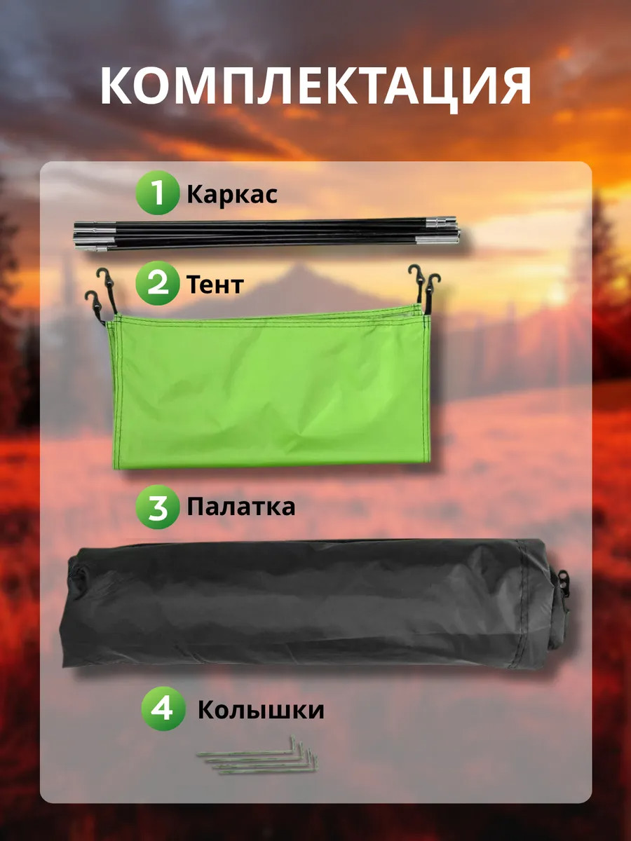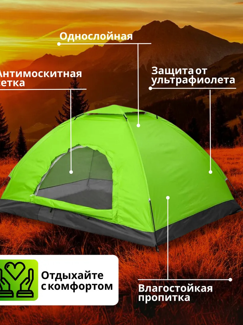 Палатка SUMMER-2 (ZH-A034-2) - это двухместная легкая и компактная палатка, которая идеально подойдет для отдыха на природе. Особенности: - Купол палатки изготовлен из однослойного материала и имеет 1 широкий вход - Тент изготовлен из полиэстера (polyester 190T) и имеет специальную пропитку, которая придает ему прочность и долговечность, а также защищает от выгорания и преждевременного износа - Антимоскитная сетка - Вентиляционные клапаны (с защитой от влаги и дождя) в верхней части палатки обеспечат комфортный микроклимат Характеристики: * Назначение: Треккинговая * Сезон: Лето * Форма палатки: Полусфера * Габариты палатки в рабочем состоянии: 190*140*95 см. * Вход: 100*55 см * Внешний тент: Polyester 190T PU 2000 мм * Материал дна: Polyester 210D PU 2500 мм * Вес палатки: 1,15 кг * Каркас: Fiberglass 7,5 мм * В комплект входят 4 ввертыша * Размер в упакованном виде: 60х12х8 см. * Цвет: зеленый