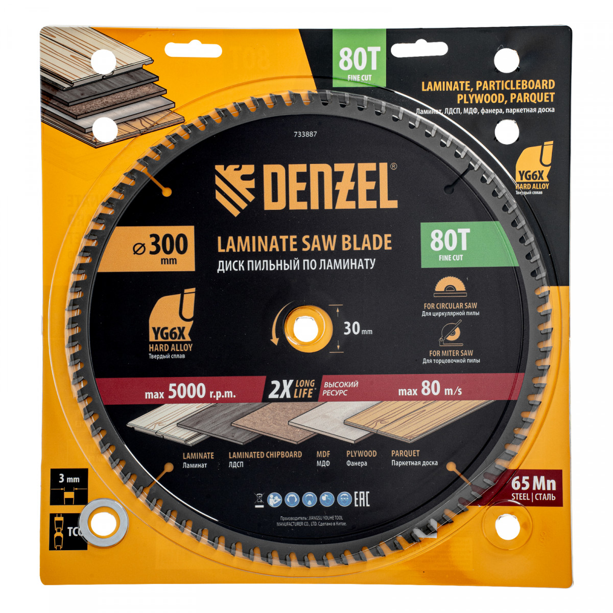 Пильный диск Denzel 733887 диаметром 300 x 30 мм, с 80 зубьями, используется для точного распиливания ламината, ЛДСП, МДФ, фанеры, паркетной доски. 80 мелких трапециевидно-плоских зубьев с положительным углом заточки позволяют эффективно решать поставленные задачи, обеспечивая максимально чистый рез. Диск устанавливается на циркулярную или торцовочную пилу, а также на распиловочный станок. Можно установить оснастку на инструмент с другим посадочным диаметром — для этого предусмотрено переходное кольцо 30/20 мм.