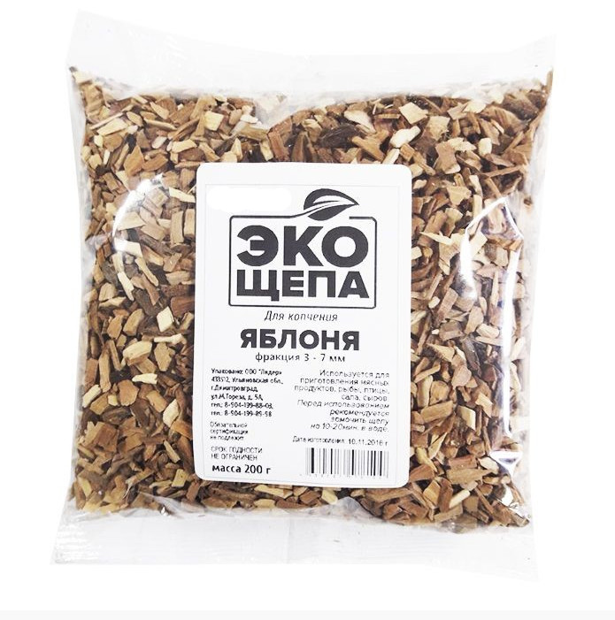 Как и любая другая фруктовая щепа для копчения, дробленая и рубленая яблоня отличается высоким содержанием ароматических смол и сахара.Поэтому эффект ее дыма более выраженный, чем древесины других пород, за исключением хвойных.Но, в отличие от хвойных пород, яблоневые щепки не придают копченостям неприятный привкус и запах.Несмотря на то, что яблоня подходит для копчения любой еды, лучшие результаты она дает при обработке жирных видов мяса (свинина, гусятина) и жирной рыбы (осетр, скумбрия), которые приобретают несколько необычный, но очень приятный аромат и привкус.Вес: 200 гр.