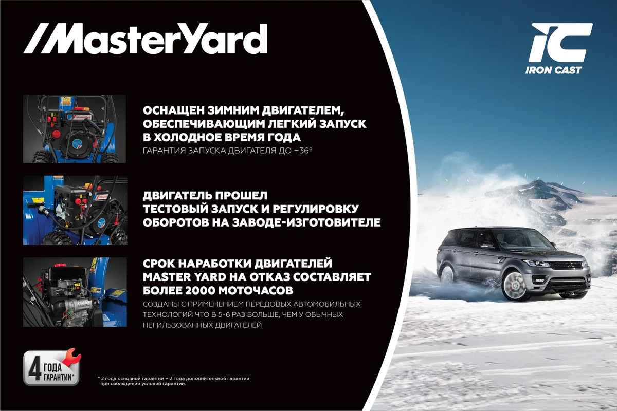 Четырехтактный бензиновый двигатель MasterYard 182cc для зимней работы. Запатентованная технология LCPower позволяет получить повышенную производительность и сниженный уровень выбросов, благодаря чему двигатель соответствует стандартам EPA Phase III и CARB. Новая камера сгорания, T-образная форма поршня и колец снижают уровень выбросов несгоревших углеводородов и предотвращают потерю мощности за счет трения. Новая система зажигания с оптимальной регулировкой опережения позволяет топливной смеси сгорать полнее, обеспечивая более высокий уровень мощности