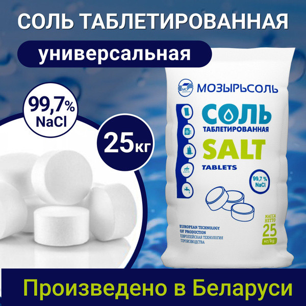 Универсальная таблетированная соль «Мозырьсоль» — это продукция из Беларуси, на 99,7% состоящая из хлористого натрия. Дополнительные компоненты: магний-иона, кальций-иона, сульфат-иона. Применяется для умягчения и очистки воды в системах водоподготовки бытового и промышленного типа. Основная форма продажи — полипропиленовые мешки 25 кг.