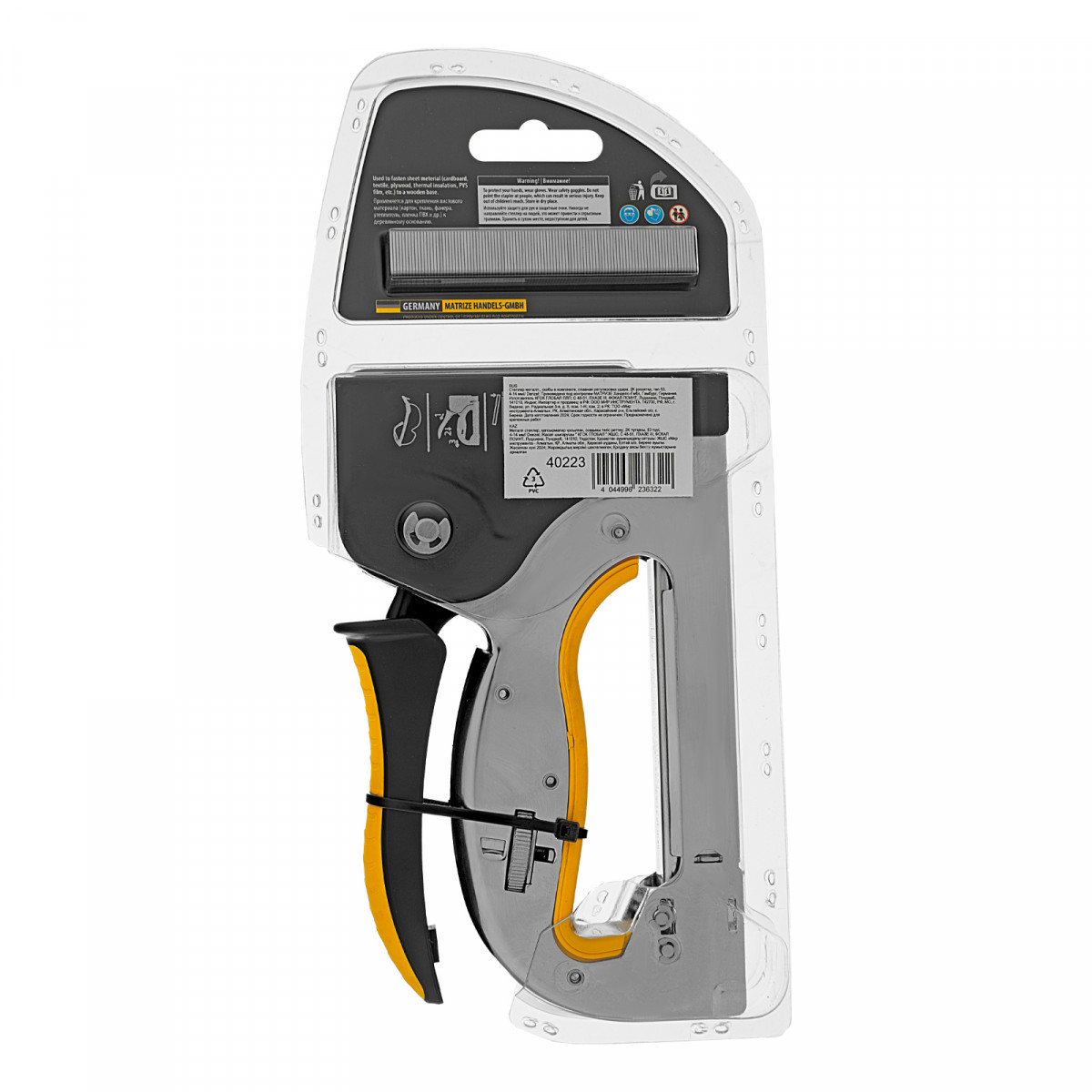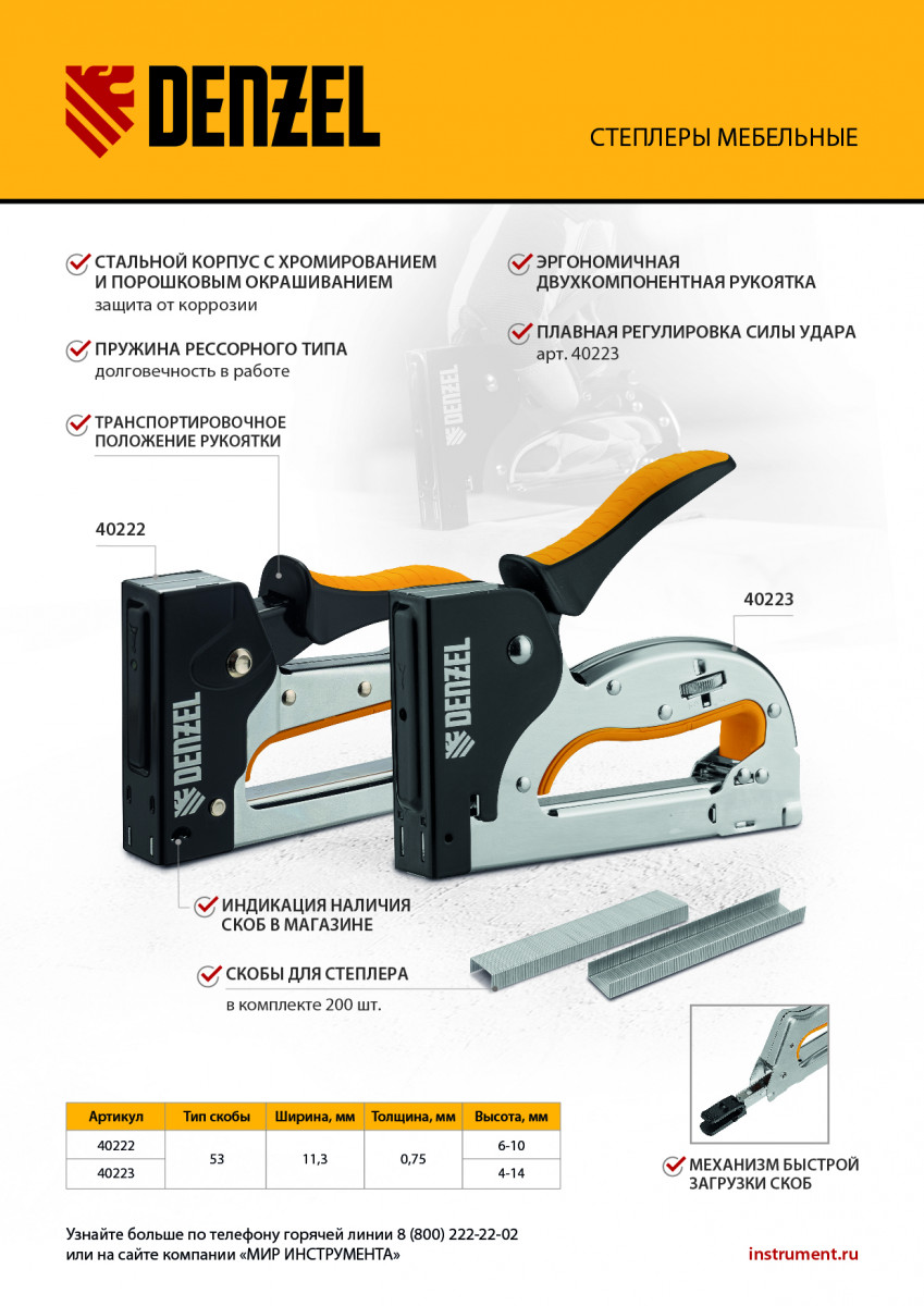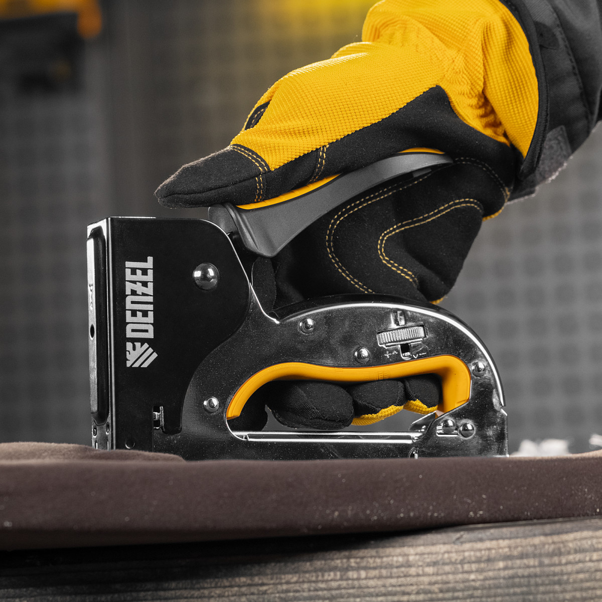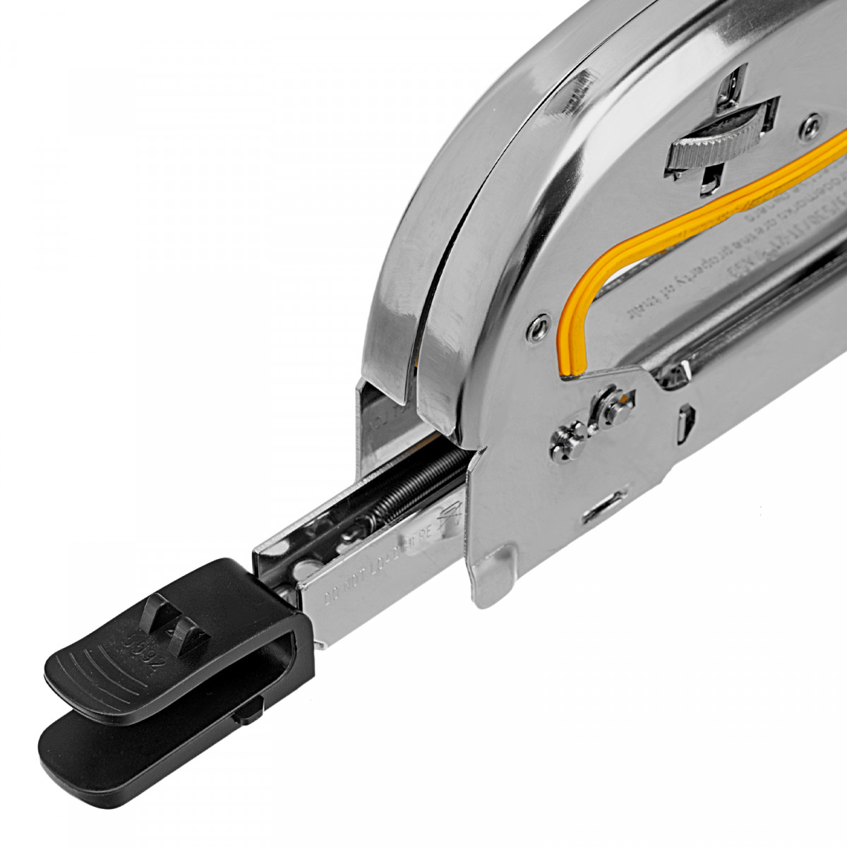 Металлический степлер Denzel 40223 с функцией плавной регулировки удара и двухкомпонентной рукояткой применяется для быстрого скрепления с деревянными основаниями листов фанеры, оргалита, ДСП, ДВП, картона или изоляционных материалов с помощью скоб типа 53 размером 4-14 мм. Инструмент подходит для частого использования, т. к. ударный механизм рессорного типа снижает усталость при длительной эксплуатации. Степлер пригодится во время сборки и обивки мебели, а также для проведения ремонтных работ.
