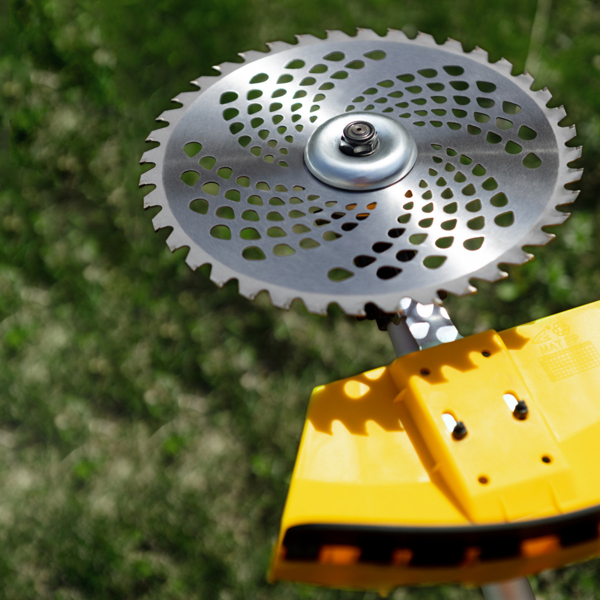 - Дополнительные возможности — можно приобрести и установить на триммер диск Denzel 96323 для быстрого удаления растительности с жесткими стеблями, 96328 для скашивания молодых побегов кустарника диаметром до 3 мм.