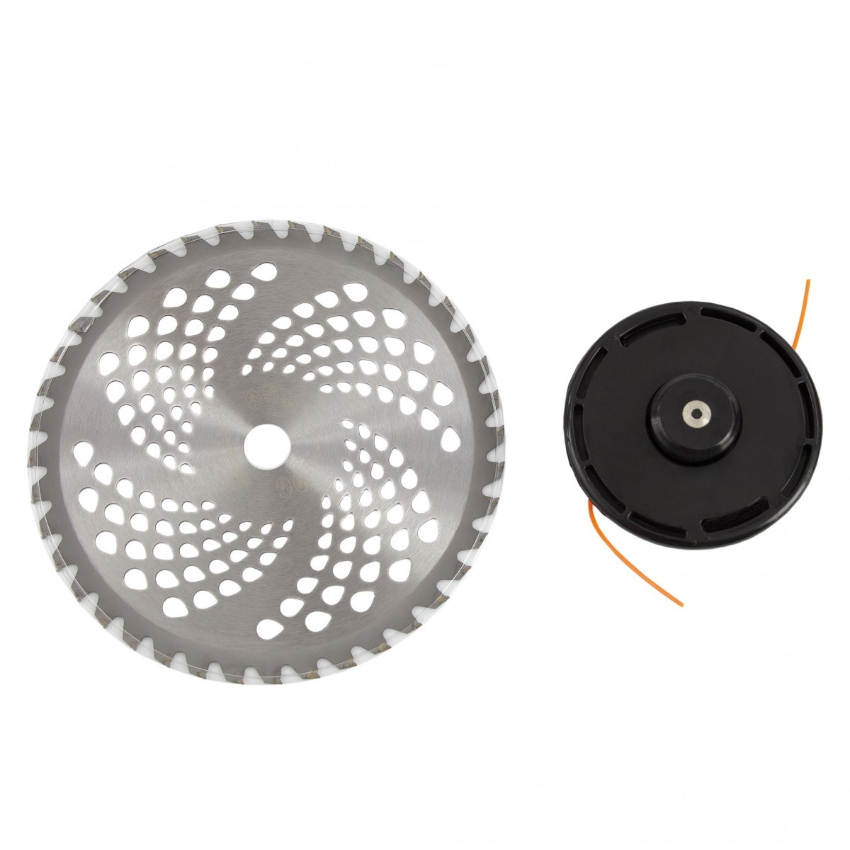 Двигатель с правой рукояткой - 1 штЛевая рукоятка - 1 штШтанга в сборе с редуктором и корпусом сцепления - 1 штЗащитный кожух с ножом - 1 штКатушка с леской - 1 штПильный диск 40Т - 1 штРемень плечевой с защитой бедра - 1 штДозатор для приготовления смеси - 1 штУзел крепления рукояток с крепежом - 1 штСвечной ключ - 1 штИмбусовый ключ Н4 - 1 штИмбусовый ключ Н5 - 1 штБолт M6×30 (для крепления корпуса сцепления к двигателю) - 4 штБолт M6×25 (для крепления защитного кожуха к штанге) - 2 штХомут - 2 штРуководство пользователя - 1 штДозатор для приготовления топливной смеси - 1 штЛеска диаметром 2 мм - 1 шт