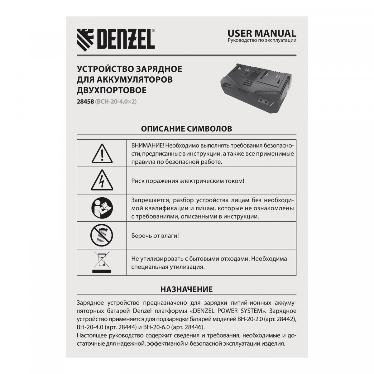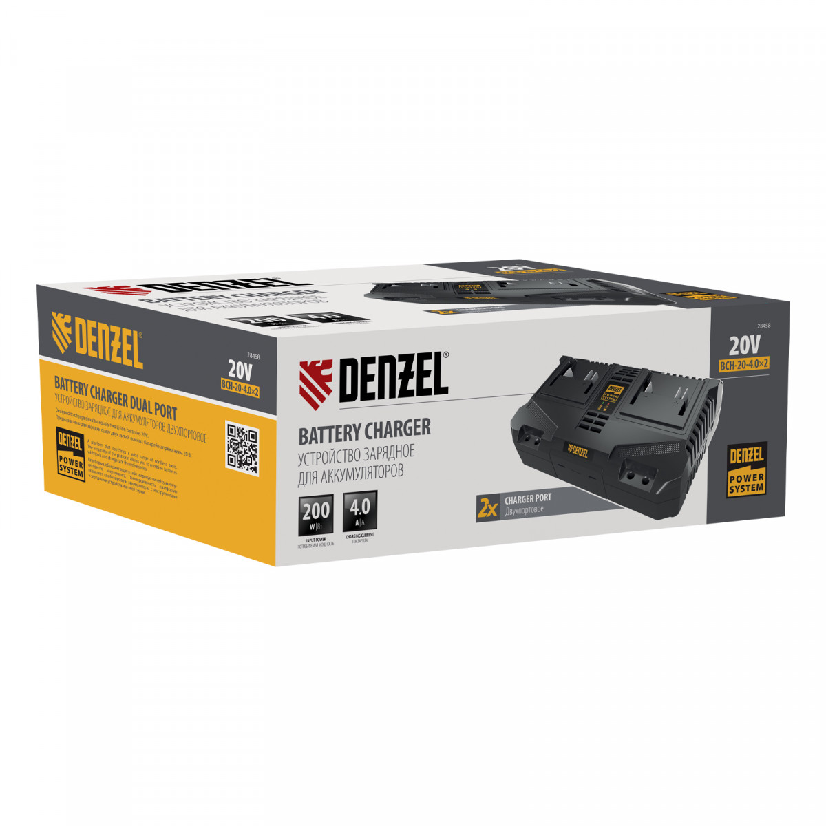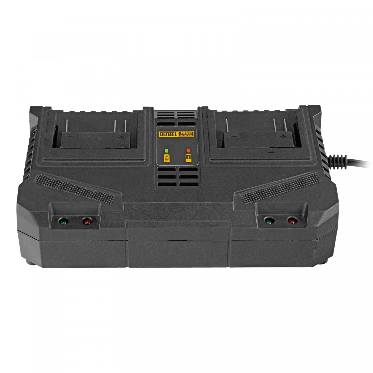 Двухпортовое зарядное устройство Denzel BCH-20-4.0x2 28458 предназначено для одновременной зарядки двух аккумуляторов единой платформы Denzel Power System 20 V. Обеспечивает ток заряда 4 A, совместимо с аккумуляторами Denzel 28442, 28444 и 28446.
